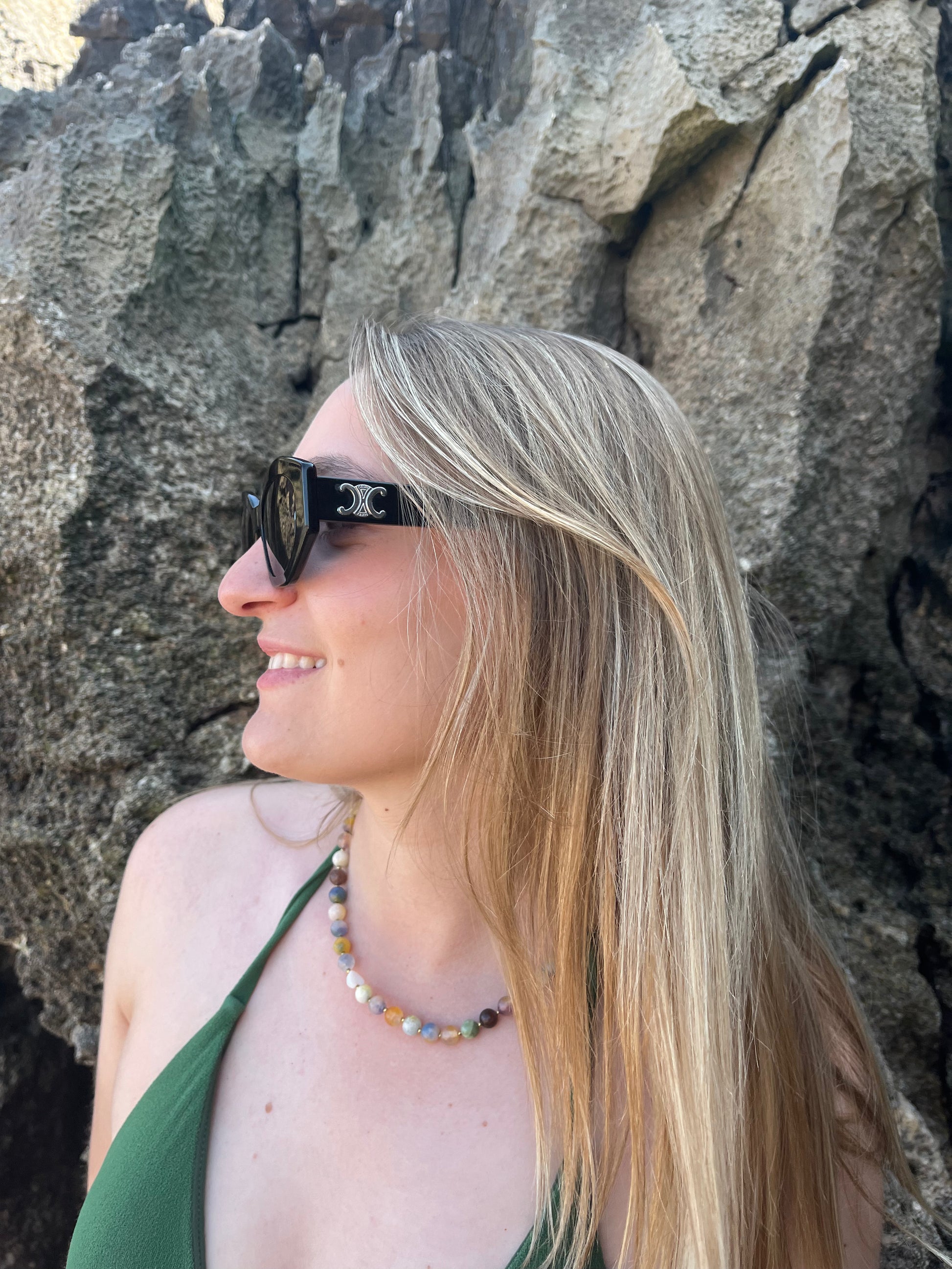 Collier en perles de Jade, avec un détail de nacre, la combinaison parfaite pour sublimer votre port de tête 🐚
