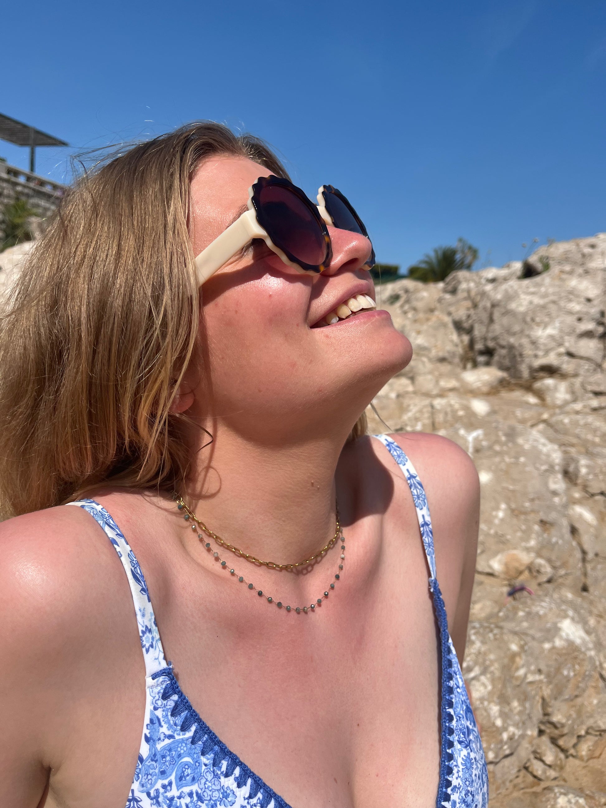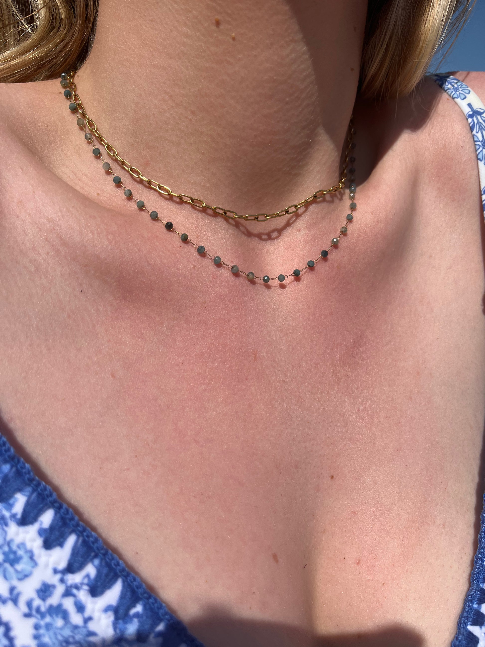 Le collier Twins est un incontournable. Pouvant être porté en sautoir ou en double, il est fabriqué à la main, dans notre atelier, en acier inoxydable et pierre semi-précieuse de Labradorite ✨